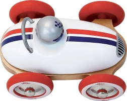 Geef kinderen een klassiek speelgoed met tijdloze charme. De houten Roadster van VILAC combineert hoogwaardig gelakt hout en metaal met rubberen wielen, waardoor de rit stil en soepel is, zowel op de vloer als op het tapijt. De elegante witte carrosserie met blauw-rode strepen en het stijlvolle bestuurdersfiguurtje benadrukken de authentieke race-look.