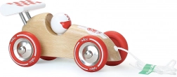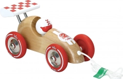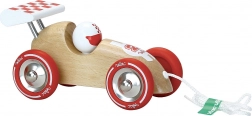 Deze elegante houten raceauto met opvallende rode details en vleugel is liefde op het eerste gezicht. Dankzij het koord nemen kinderen hem gemakkelijk mee door het huis en buiten, waarbij ze spelenderwijs stabiliteit en coördinatie ontwikkelen. De met rubber beklede metalen wielen zorgen voor een soepele en stille rit.