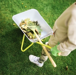 De set bevat een schep, hark en katoenen handschoenen, wat het een ideaal pakket maakt voor kleine tuinhelpers.
