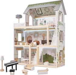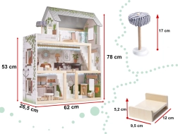 Het houten poppenhuis LULILO Floro is ontworpen in boho-stijl, wat het niet alleen mooi maar ook functioneel maakt. Met zijn drie verdiepingen en het ruime terras biedt het volop ruimte voor verschillende scènes en spelletjes. Het huis is uitgerust met vier kamers: keuken, badkamer, woonkamer en slaapkamer, waarbij elke kamer rijkelijk is ingericht zoals in een echt huis.