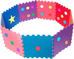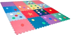 Levende kleuren en vormen (stipjes, ster) stimuleren de zintuigen en ondersteunen de ontwikkeling van fijne en grove motoriek. De foam dempt schokken en beschermt tegen kou van de vloer.