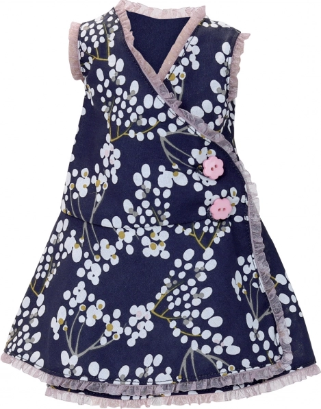 Donkerblauwe jurk met bloemendessin, V-hals, sierlijke bies en roze knoopjes geven de pop een speelse en elegante uitstraling.