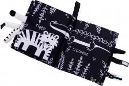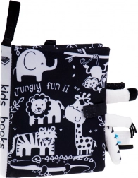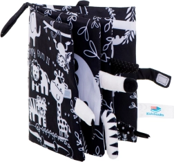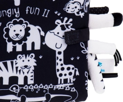 Dit zachte zintuigen-boekje is de ideale metgezel voor baby’s van 0+. Contrasterende zwart‑witte illustraties van safaridieren (giraf, leeuw, olifant, aapje, tijgertje, krokodil) trekken de aandacht en ondersteunen de juiste ontwikkeling van het zicht in de eerste maanden. Uitstekende zachte staartjes nodigen uit tot aanraken en trainen de greep.