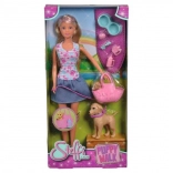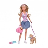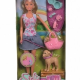 Panenka Steffi Love tijdens een wandeling met twee schattige puppy's. Deze pop bevat stijlvolle kleding en essentiële accessoires voor de verzorging van huisdieren, wat een geweldige gelegenheid biedt voor kinderen om hun verbeeldingskracht en liefde voor huisdieren te ontwikkelen.