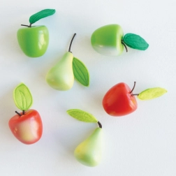 6 stuks fruit (2 rode appels, 2 groene appels, 2 groene peren) + 1 houten kistje