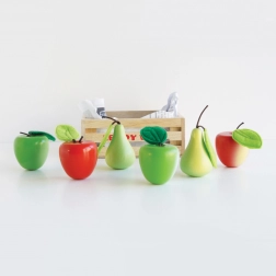 Het houten kistje met appels en peren uit de HONEYBAKE-collectie brengt realistisch winkelspeelgoed, een boerenmarkt of een keukentje tot leven. Elk stuk fruit heeft een vilten steeltje en een geborduurd blaadje voor een authentieke uitstraling. Het kistje heeft praktische handgrepen voor gemakkelijk dragen.