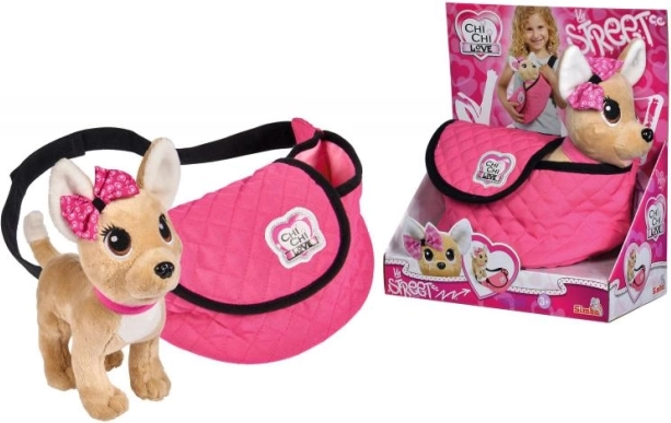 Ga op avontuur met de pluche Chi Chi Love-hond, de perfecte modieuze accessoire voor alle kleine hondenliefhebbers. De elegante roze halsband past perfect bij het moderne roze tasje met zwarte bies, ideaal om stijlvol te dragen.
