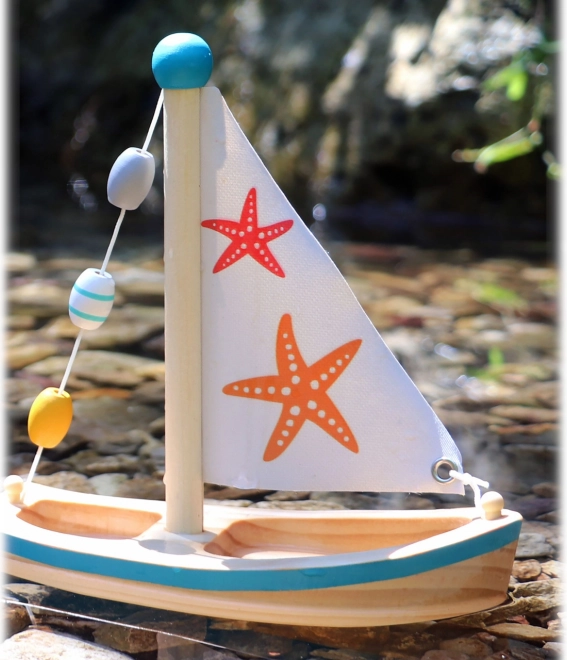 Small Foot houten zeilboot met zeesterren voor in het water