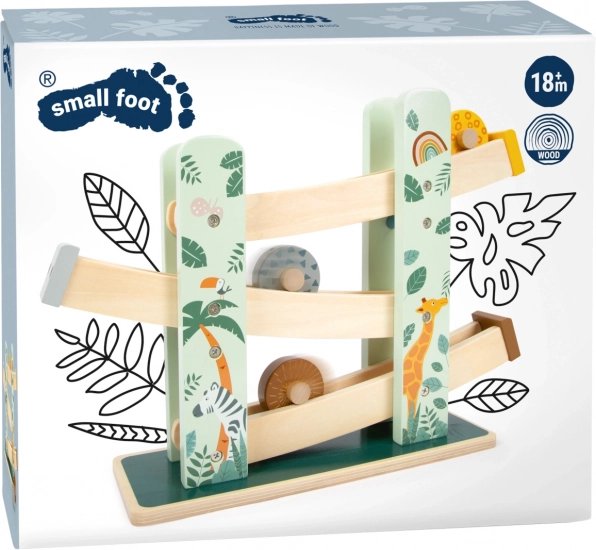 Deze prachtige houten racebaan biedt kinderen de mogelijkheid om te zien hoe drie wielen, elk met een uniek ontwerp, naar beneden rollen over de drie hellingen. Versierd met illustraties van safari-dieren en jungleplanten.