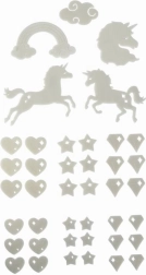 Creëer in een handomdraai een magische sfeer. De set fluorescerende decoraties met een eenhoornthema licht zacht op in het donker nadat ze aan licht zijn blootgesteld en verandert elke kinderkamer in een sprookjesrijk. De onderdelen bevestig je eenvoudig met kleefgum, die is inbegrepen.
