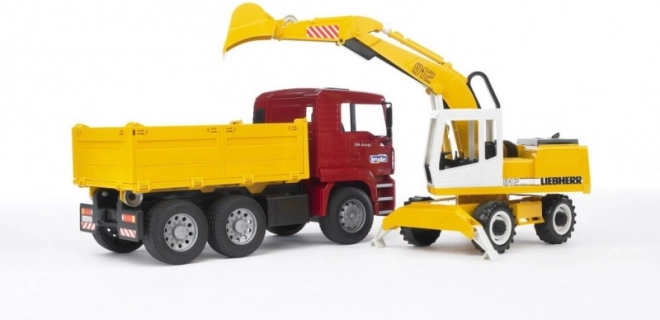 Deze fantastische bouwset van Bruder omvat een MAN TGA-vrachtwagen met zachte banden en een praktische kiepbak. Daarbij hoort een functionele Liebherr-graafmachine met stabilisatiesteunen, geprofileerde banden en een graafarm met een cabine die 360° draait. Het product is in Duitsland kwalitatief afgewerkt met duurzame materialen.