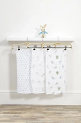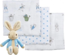 Prachtige cadeauset bevat 3 mousseline luiers en een pluchen konijntje Petr. De luiers zijn gemaakt van 100% katoen, wasbaar en elk heeft een andere print.