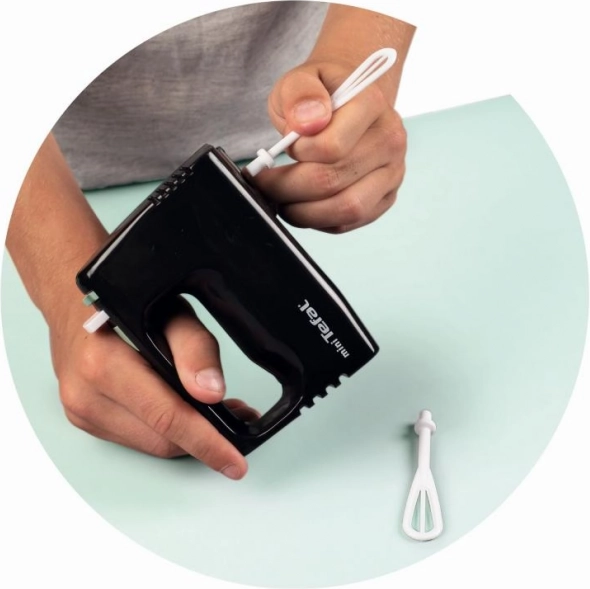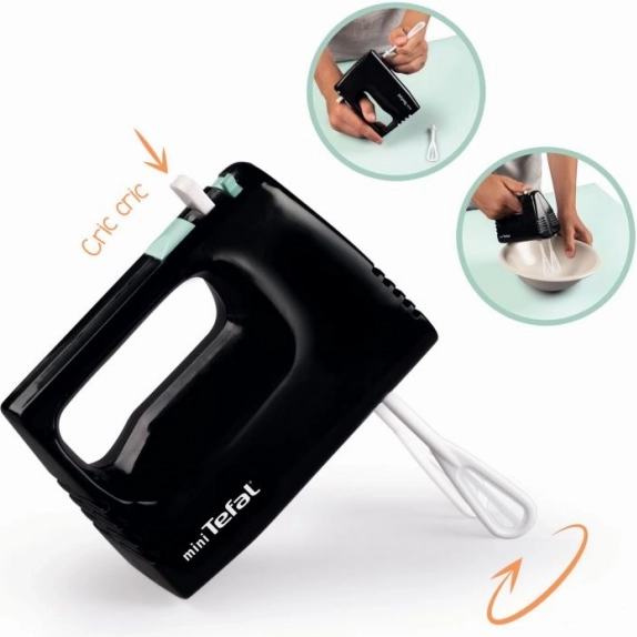 Mini mixer Tefal Express is een ideale aanvulling op elke kinderkeuken set. De gardes draaien mechanisch door het indrukken van de knop en vereisen geen batterijen.