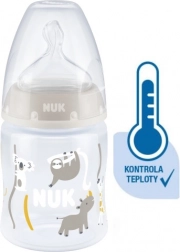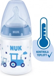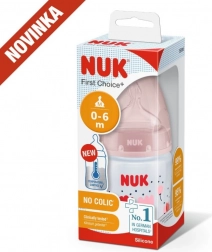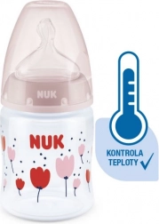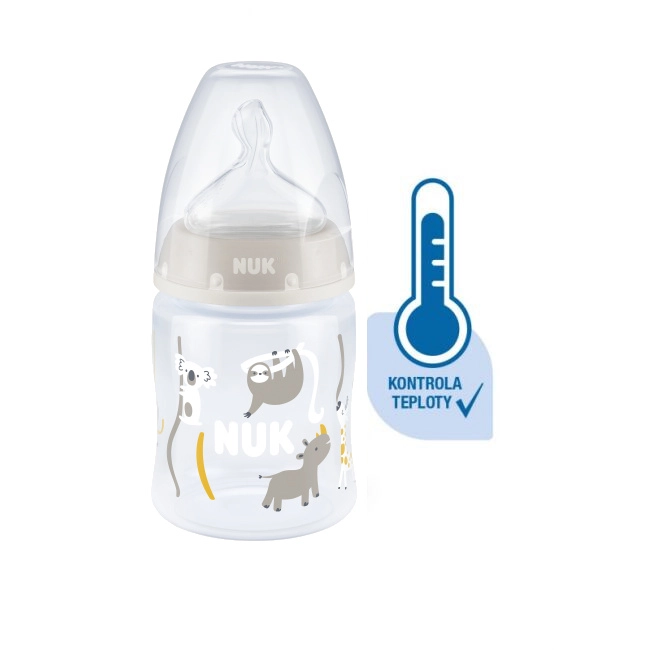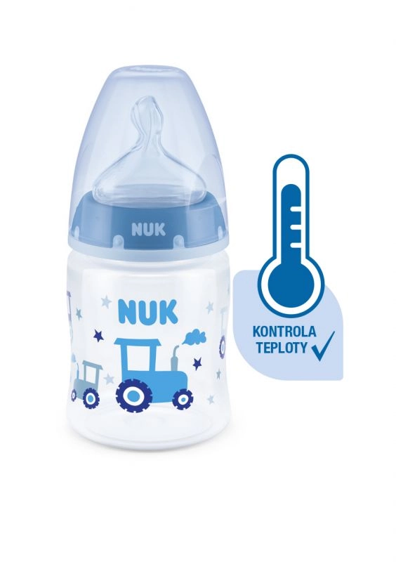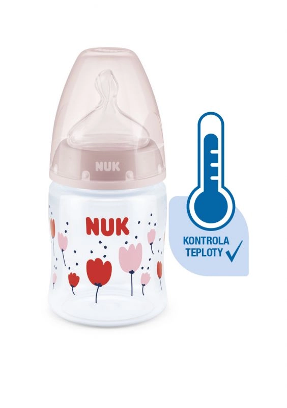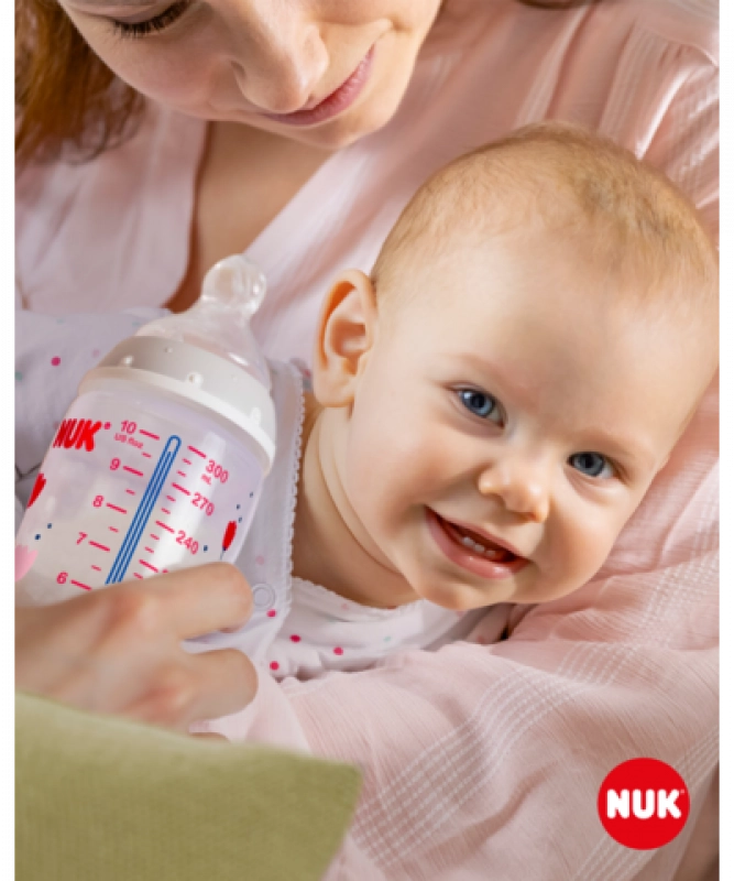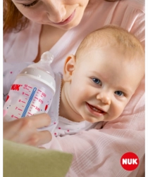 Temperatuurcontrole helpt ouders de optimale temperatuur te bereiken en zo veilig voeden van hun kind te waarborgen. Rustig en veilig voeden dankzij temperatuurcontrole. Wanneer een baby honger heeft, mag de voeding in de fles niet te heet en niet te koud zijn. Daarom controleren moeders en vaders vóór elke maaltijd de temperatuur van de voeding. Het is niet eenvoudig om te bepalen wanneer de voeding precies de juiste temperatuur heeft. Daarom zijn de NUK First Choice+ babyflessen met temperatuurcontrole ontwikkeld. Deze functie is in deze vorm niet eerder geïntroduceerd. NUK First Choice+ babyflessen zijn nu uitgerust met een nieuwe temperatuuraanduiding en helpen voorkomen dat je kind te hete voeding drinkt. De indicator ziet eruit als een thermometer, is geplaatst tussen de maataanduidingen en verandert van kleur afhankelijk van de temperatuur van de inhoud. Deze functie helpt ouders de optimale temperatuur te bereiken bij het voeden van hun kind. Als de voeding te heet is, verandert de blauwe indicator in wit. Idealiter heeft de voeding lichaamstemperatuur (37 °C), wat overeenkomt met een blauwe kleuring van het display. Let op: de temperatuurcontrole is bedoeld als extra controle. Voor het voeden moet de temperatuur ook handmatig worden gecontroleerd. Om de temperatuur te testen raden wij aan een paar druppels op de binnenkant van de pols te laten vallen. De meest natuurlijke speen voor je kind. Al vele jaren zijn First Choice-flessen de eerste keus voor flessenvoeding naar het voorbeeld van borstvoeding. Met First Choice+ zijn we de natuur nog dichter genaderd – ze ondersteunen een gezonde kaakontwikkeling en geven je baby het gevoel aan de borst te drinken. Natuurlijk en correct gevormd voor de kaak. De unieke vorm van NUK-spenen is gemodelleerd naar de tepel van de moeder tijdens het voeden. De speen laat voldoende ruimte voor natuurlijke zuigbewegingen van tong en kaak van je kind. Zacht als moeders borst. De siliconen speen is dankzij de nieuwe soft zone beter aangepast aan het gehemelte van je baby en zorgt zo voor een natuurlijk drinkgevoel. Voorkomt koliek. Het verbeterde Anti-Koliek Air System zorgt voor een gelijkmatige drinkstroom zonder lucht te slikken. Klinisch getest. Dankzij de bijzonder natuurlijke vorm wordt de speen door baby’s zeer goed geaccepteerd. Dat betekent dat ze bij uitstek geschikt zijn voor baby’s die zowel borstvoeding krijgen als uit de fles drinken. Babyfles: praktische NUK temperatuurcontrole-indicator die van blauw (koud) naar wit (te heet) verandert. Vrij van schadelijke stoffen en geurtjes – bevat geen BPA. Eenvoudig te vullen en te reinigen – extra brede fleshals. Zeker vast te houden en stabiel – dankzij de ergonomisch gevormde fles en brede bodem. Onbeperkt combineren – compatibel met alle NUK First Choice producten. Wetenschappelijke studie: Moral et al. BMC Pediatrics 2010, 10:6. Meer informatie op http://nuk.com/research. Onafhankelijk marktonderzoek met 205 kinderartsen, Duitsland 2018. 99% van de moeders bevestigde dat de NUK First Choice+ Control fles geen koliek veroorzaakt. Belangrijkste kenmerken: de temperatuur van de inhoud verandert de kleur van de indicator: als de voeding te heet is, verandert blauw in wit; ideaal voor de babykaak, speen van extra zachte siliconen, 0–6 maanden M (middengrote opening = voor babyvoeding); klinisch getest: voor een optimale combinatie van borst- en flesvoeding; aantrekkelijk design