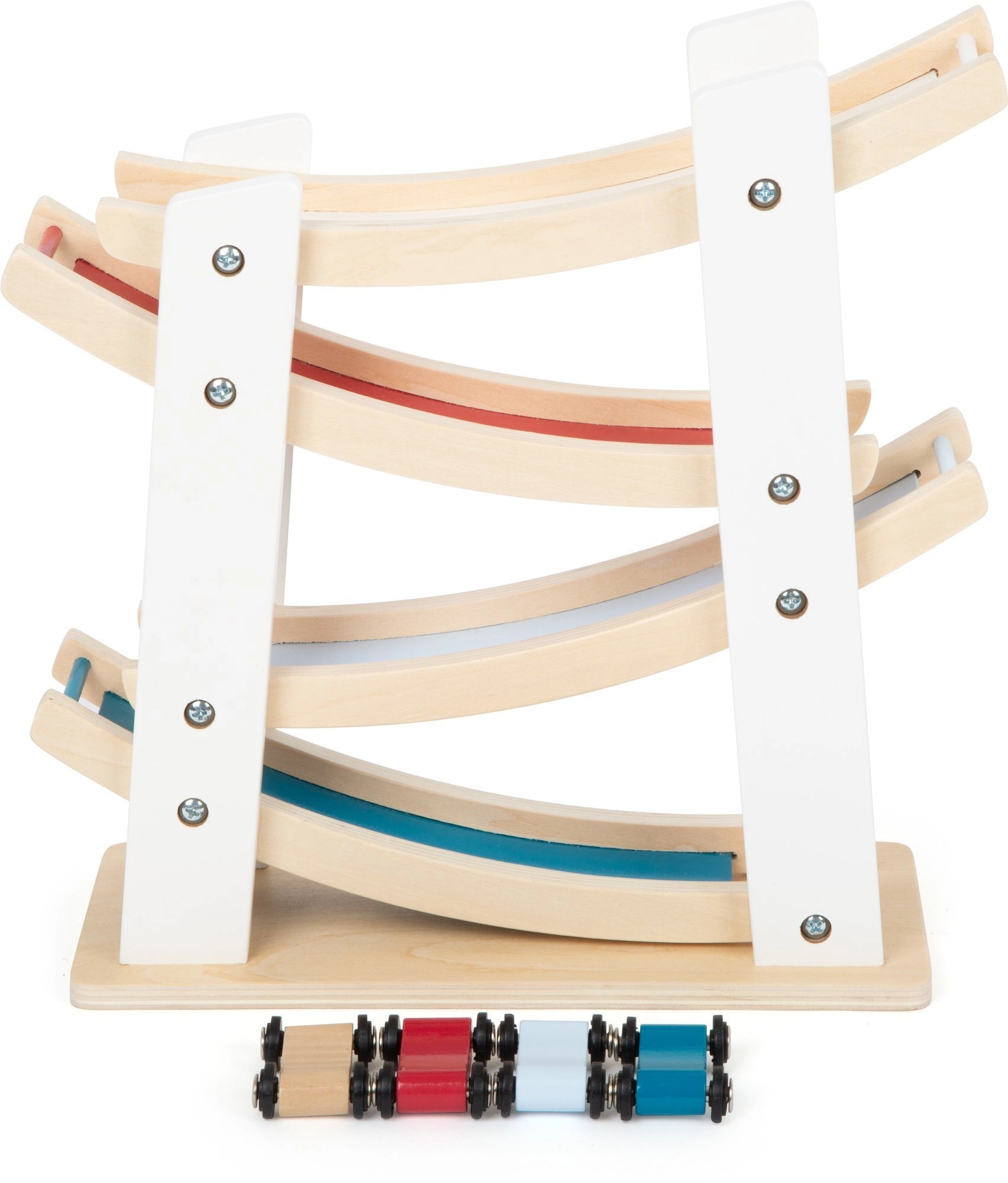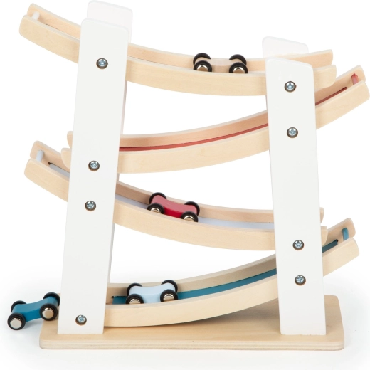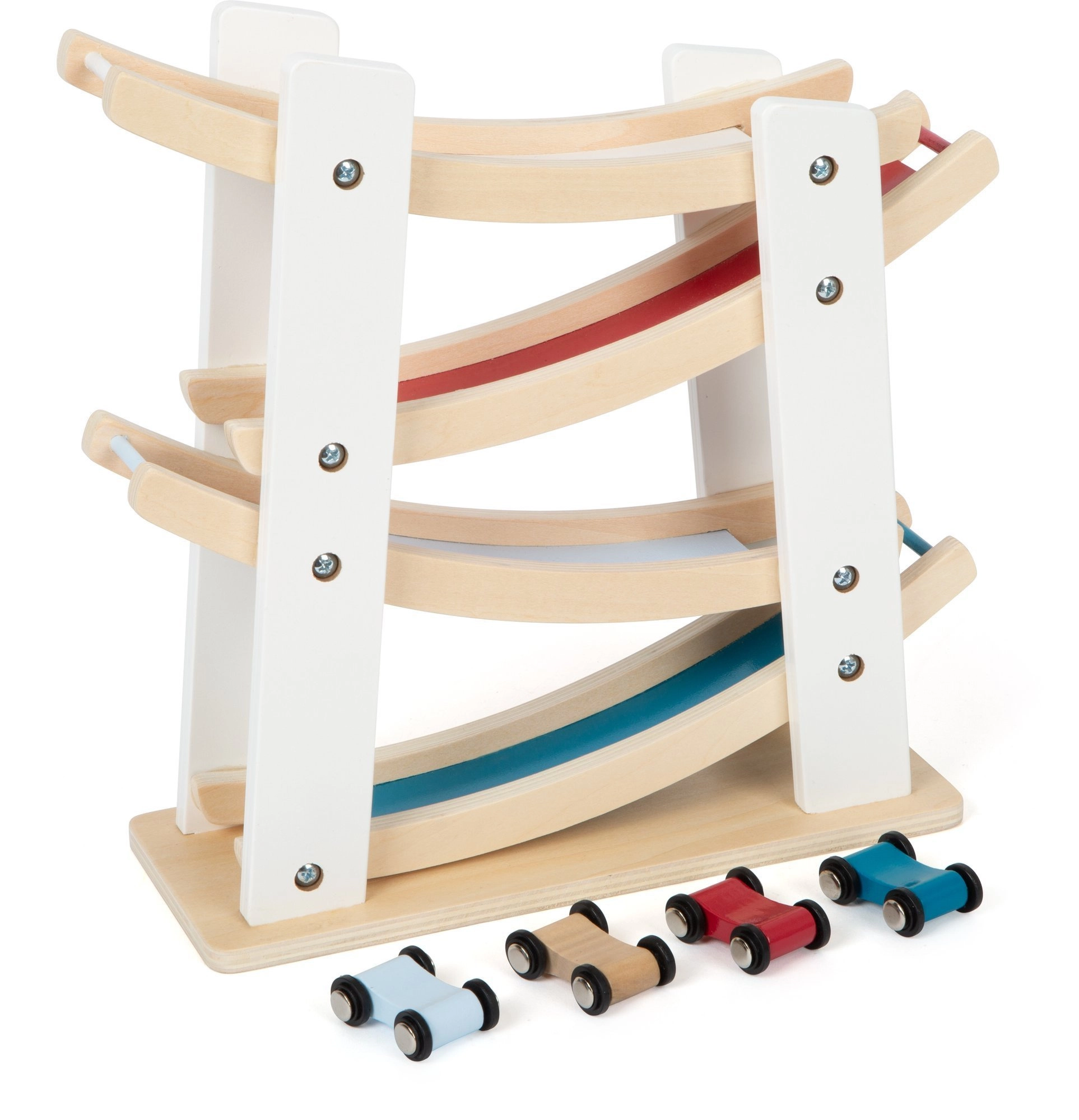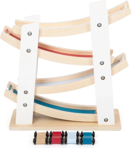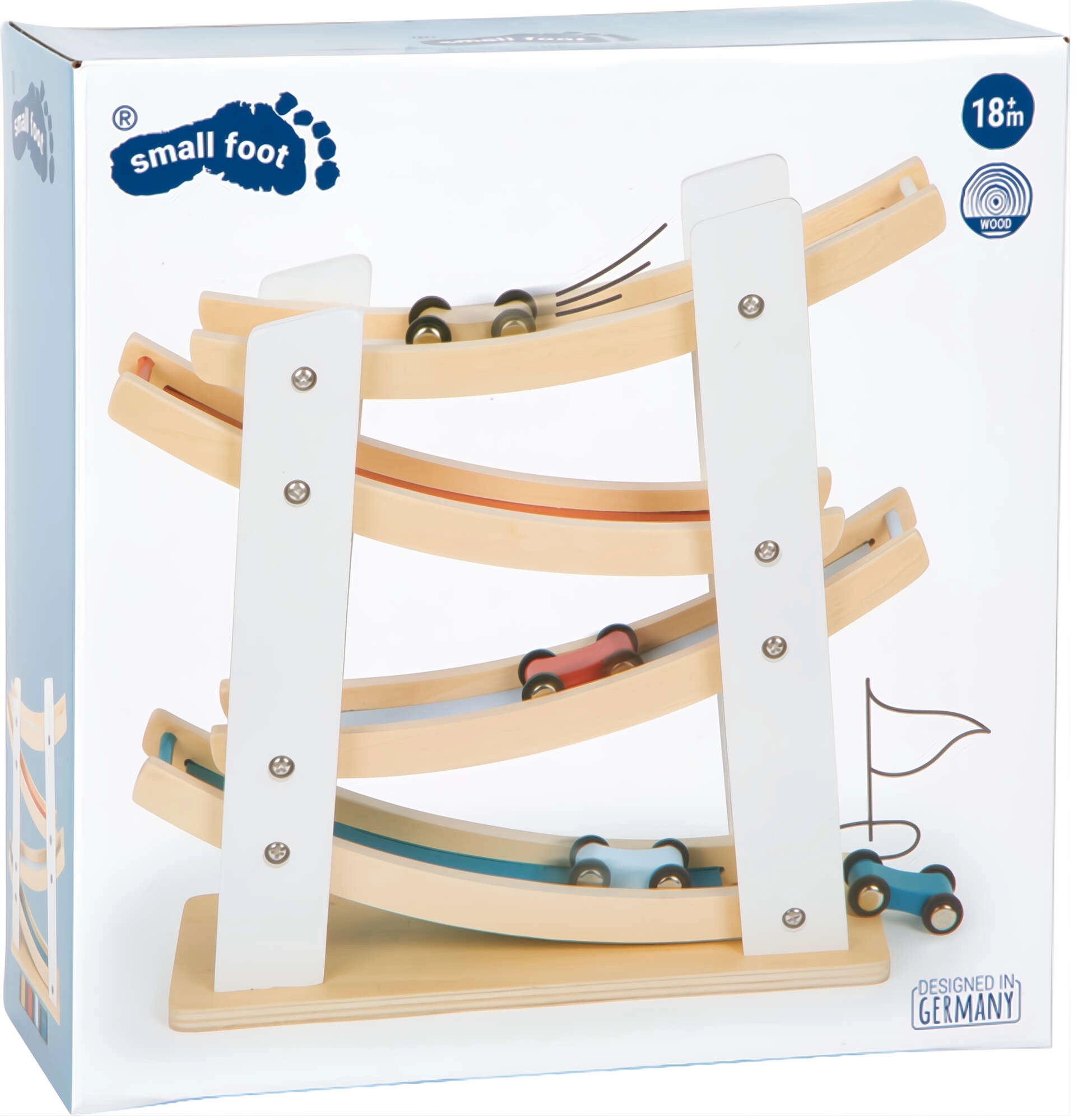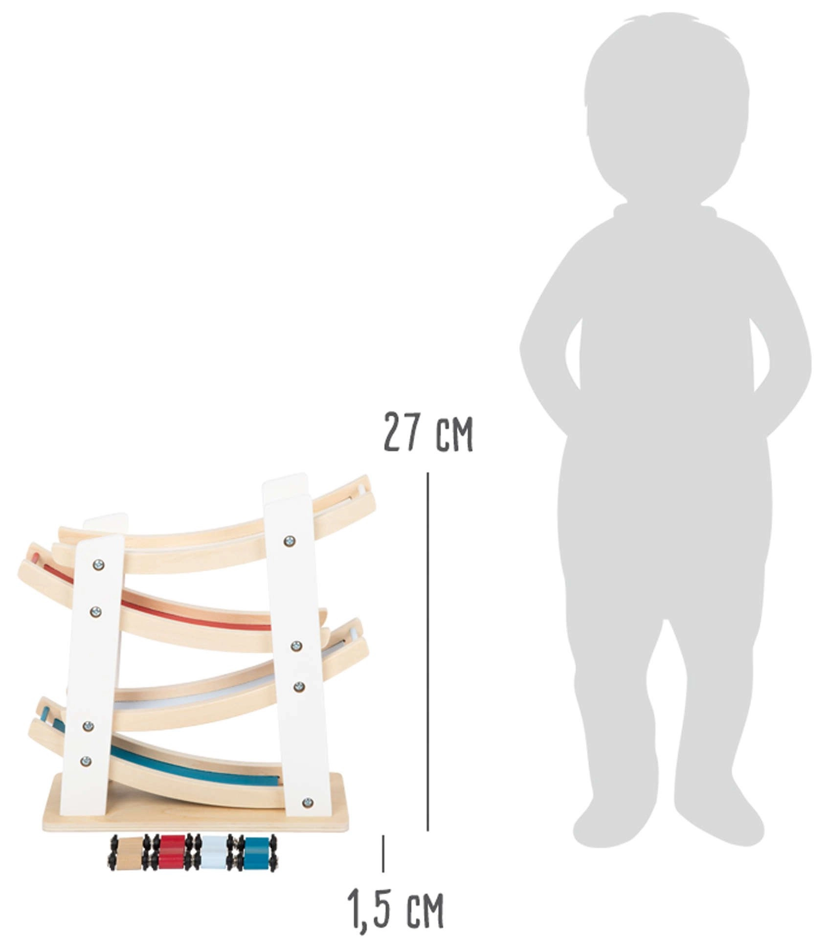 Ontdek speelplezier voor de allerkleinsten met de houten racebaan met autootjes van Small Foot. De robuuste constructie van natuurlijk hout, vier kleurrijke autootjes en het vloeiende glijden over de cascade-hellingen stimuleren de fijne motoriek, oog-handcoördinatie en het begrip van oorzaak en gevolg. De ideale speelset vanaf 18 maanden voor dagelijks creatief spel.