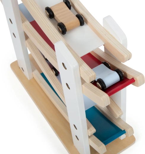 Deze kwalitatieve houten baan biedt een eenvoudig principe waar kinderen dol op zijn: plaats een autootje op het bovenste niveau en kijk hoe het vlot over de bochten naar beneden glijdt. De stabiele basis en gladde oppervlakken zorgen voor veilig en langdurig gebruik.