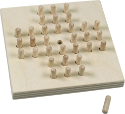 De houten solitaire van Detoa biedt slimme uitdaging in een compact formaat. Het spel begint met het verwijderen van de middelste pin en gaat verder met het overspringen van aangrenzende pinnen horizontaal of verticaal. Elke overgesprongen pin wordt van het bord genomen – plan je zetten vooruit en probeer er aan het einde slechts één over te laten.