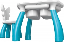 De tafel dient niet alleen voor het bouwen met blokken, maar ook als oppervlakte voor schrijven en tekenen.