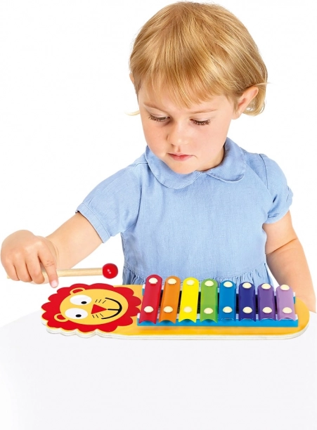 De kinderxylofoon met de vrolijke leeuwtjeslook brengt spelenderwijs leren en creatief musiceren samen. Acht kleurrijke metalen plaatjes op een houten basis klinken helder en prettig, zodat kinderen gemakkelijk tonen, ritmes en hun eerste melodieën ontdekken. In de verpakking zitten twee houten stokjes voor comfortabel spelen met beide handen.