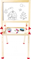Dit hoogwaardige kinderbord combineert een wit magnetisch oppervlak voor het vastzetten van afbeeldingen en schrijven met stift met een klassiek lei-bord voor tekenen met krijt. Dankzij de hoogteverstelling en de stabiele houten constructie groeit het met het kind mee en past het perfect in de kinderkamer of speelhoek.