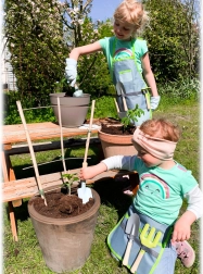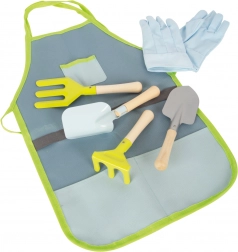 De set bevat ook handschoenen die kinderhanden beschermen en een schort dat voorkomt dat kleding vies wordt tijdens tuinieren en knutselen.