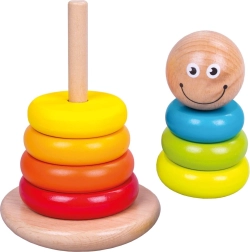 De houten stapelaar met gekleurde ringen ondersteunt natuurlijk leren door spel. Kinderen oefenen sorteren op grootte, kleuren herkennen en behendigheid bij het rijgen van ringen op de staaf. Het speelgoed heeft een prettig glad oppervlak en een stabiele basis voor veilig spelen.