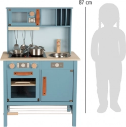 Stijlvol en duurzaam houten kinderkeukentje in rookblauwe kleur met lederen handgrepen. De set bevat metalen keukengerei en servies, inclusief pan en koekenpan, voor een realistische kook- en opruimervaring.