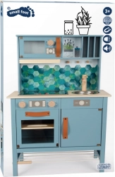 De oppervlakken in de koelkast en oven zijn bedrukt met keukendetails voor nog meer speelplezier. Het dubbelzijdige achterpaneel biedt een moderne tegel-look of een eenvoudig blauw design. Het keukentje is een geweldige aanvulling op andere producten en apparaten uit de Tasty-collectie.
