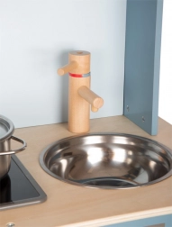 Het kinderkeukentje in rookblauwe tint met stijlvolle lederen handgrepen biedt een realistische kookbeleving.