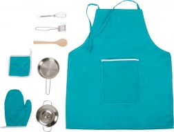 Uitgebreide kookset met een pan met deksel, koekenpan, garde, spatel en houten lepel. Inclusief ook een kinderschort, pannenonderzetter en stoffen ovenwant. Ideaal accessoires voor creatief spel in de kinderkeuken.