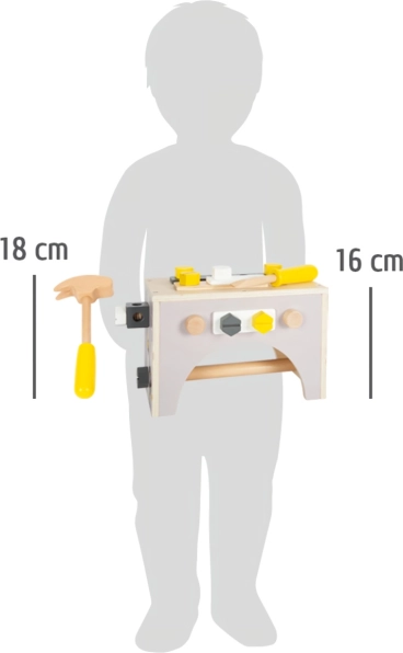 Ontdek het slimme 2-in-1 speelgoed: na het omdraaien verandert de kist in een werkblad waarop kleine klussers kunnen schroeven, vastdraaien en bouwen. Natuurlijk hout in combinatie met gele en grijze accenten zorgt voor een tijdloze look en lange levensduur.