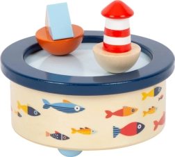 Een betoverende houten muziekdoos met een maritiem thema die kinderen in slaap wiegt met een Duitse wiegenlied. Op de bovenkant draaien een vuurtoren en een bootje mee op het ritme van de melodie, op hun plaats gehouden door magneten. Veilig afgeronde randen, prettig houten materiaal en kwalitatief hoogwaardige print in moderne kleuren maken het een ideale aanvulling voor de kinderkamer.