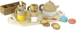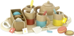 De set bevat: 4 kopjes, 4 lepeltjes, 1 theepot, 4 theezakjes, 2 macarons, 4 koekjes in een doosje en 1 dienblad. Alles is gemaakt van hoogwaardig hout met gladde randen voor veilig en langdurig speelplezier. Stimuleert de ontwikkeling van verbeelding, taal en sociale vaardigheden.