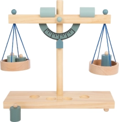 Deze stabiele houten schaalweegschaal is ideaal voor het kinderwinkeltje en het speelkeukentje thuis. Twee hangende schalen en een set van vier houten gewichten maken het kinderen mogelijk het “warenassortiment” nauwkeurig te wegen en te begrijpen hoe balans werkt. De verschuifbare contragewichten aan de armen dienen voor fijne afstelling – een geweldige manier om geduld en concentratie te trainen.
