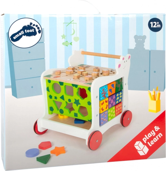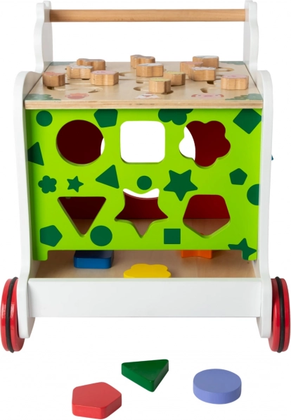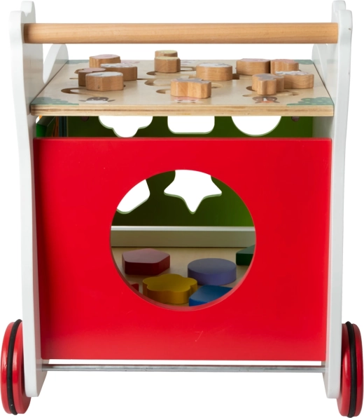Dankzij de gerubberde wielen is de beweging stil en vriendelijk voor alle vloertypen. Bovendien biedt de loopwagen opbergruimte voor blokken en kleine spulletjes, zodat de speelhoek snel is opgeruimd.