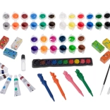 De set bevat diverse hulpmiddelen zoals kleurpotloden, markers, oliekrijtjes, verf en penselen, wat creatief uitdrukken bevordert.