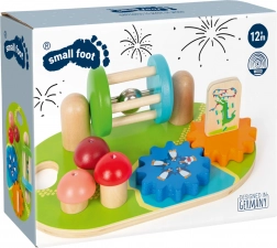 De houten plaat biedt diverse bewegende elementen zoals tandwielen en schuifknoppen om de fijne motoriek te ontwikkelen.
