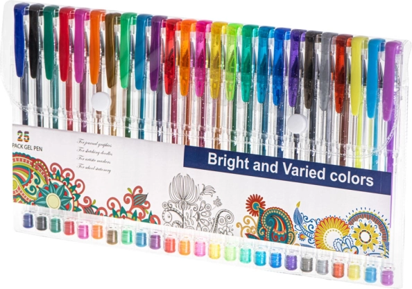 Deze veelzijdige set gelpennen is ideaal voor kinderen, studenten en volwassenen. Bevat 25 zorgvuldig geselecteerde stuks: 12 glinsterende voor opvallende decoraties, 7 metallic voor stijlvolle accenten, 3 fluorescerende voor krachtige markeringen en 3 klassieke kleuren (zwart, blauw, rood) voor dagelijks schrijven. Het transparante lichaam maakt het eenvoudig om het inktniveau te controleren en de fijne punt zorgt voor precieze lijnen.