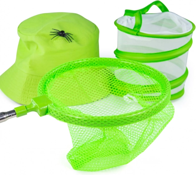 Net, vangpotje, loep, vangpincet, verrekijker en hoed – complete uitrusting voor het veilig vangen en observeren van insecten en de natuur.