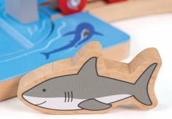 De draaikolk met haaien verandert elke houten treinbaan in een spannende oceaanmissie. Kinderen bedienen het draaiende baansegment en beslissen of de trein veilig langs de haaienvinnen rijdt. Dit spelelement brengt spanning, verhalen en actieve betrokkenheid in het spel.