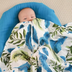 Kleed je baby in comfort en zachtheid. Deze bamboe mousselinedeken is ontworpen voor maximaal comfort met een prachtig veren- en bladenmotief. Gemaakt van 70% bamboe en 30% katoen, ideaal voor warme dagen dankzij zijn ademend vermogen en verkoelend gevoel.