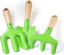 Elk onderdeel is ontworpen voor kleine handjes: gladde houten handgrepen liggen prettig in de hand, metalen delen zijn duurzaam en de stoffen handschoenen bieden bescherming tijdens het werk. De set is ideaal voor spel in de tuin of in de zandbak en dankzij de compacte verpakking is alles altijd bij de hand.