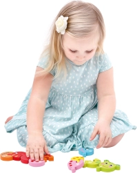 Duurzame uitvoering van massief hout en heldere, veilige verven zorgen voor een lange levensduur en veilig spelen. De stukken zijn groot genoeg en liggen goed in kleine handjes, waardoor ook beginners de puzzel aankunnen.