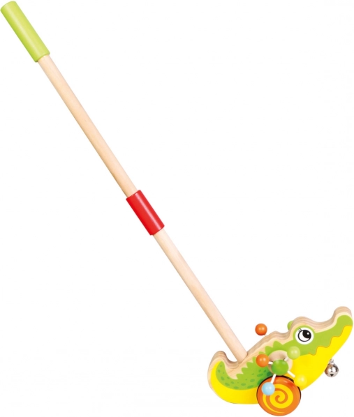 Hoogwaardige, populaire houten speelgoed in krokodillendesign. Krokodil op een stok met belletje; tijdens het rijden maakt hij geluid. Een speelgoed dat het kind voor zich uit kan duwen en helpt de motorische vaardigheden te ontwikkelen. Kinderen leren op deze manier ook kleuren en dieren te onderscheiden. De duwkrokodil heeft rubberen wieltjes voor stille werking. Kinderen kunnen hem binnen en buiten duwen of trekken. Een prachtig cadeau voor uw kind. Belangrijkste kenmerken: ondersteunt het kind bij de eerste stapjes, leuk en schattig, bevordert de motorische vaardigheden