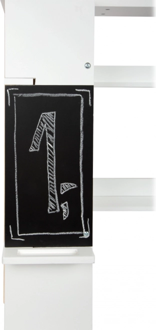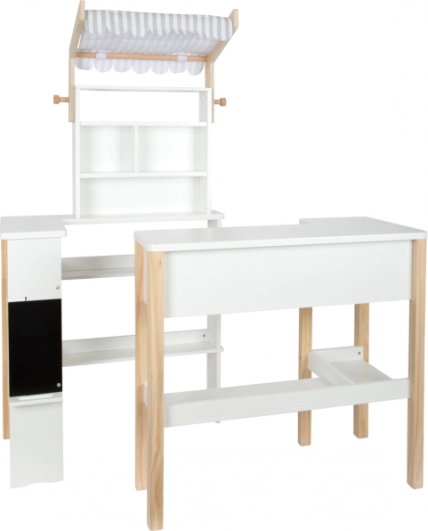 De houten verkoopkraam SMALL FOOT Fresh verandert de kinderkamer in een kleine markt. De minimalistische look in wit en naturel hout past in elk interieur, terwijl de afneembare gestreepte luifel een authentieke winkeluitstraling geeft. Het beschrijfbare bord met plankje nodigt uit tot het maken van opschriften en prijskaartjes.