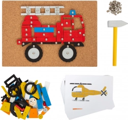 Uitgebreide creatieve speelset met het thema verkeer, met een kurken ondergrond, een houten hamer en vele houten onderdelen in verschillende vormen en kleuren. Helpt creativiteit, vaardigheid en oog-handcoördinatie te ontwikkelen.