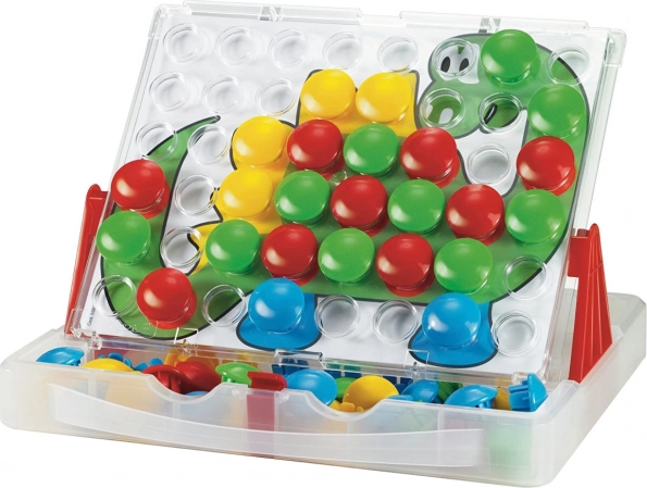 De mozaïek in een praktisch koffertje maakt het mogelijk om vrolijke afbeeldingen te leggen volgens de meegeleverde sjablonen of naar eigen fantasie. De plaat kan in de steunen worden geschoven en ook verticaal worden gebruikt voor nog comfortabeler spelen. Grote, kleurrijke pinnetjes zijn veilig en gemakkelijk vast te pakken, zelfs voor kleine kinderhanden.
