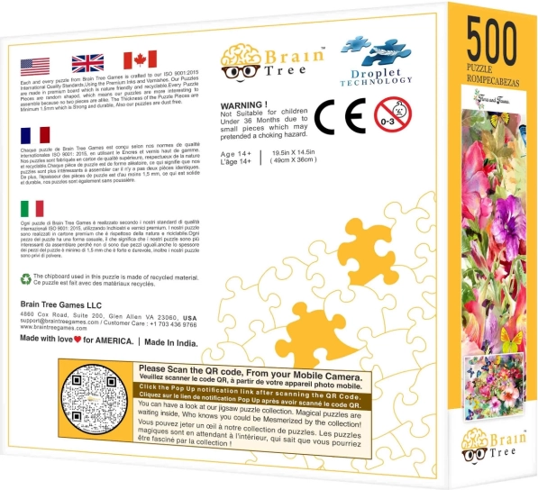 Puzzels uit de Brain Tree-serie zullen je betoveren met hun aantrekkelijke design, dat de schoonheid van bloemen en vlinders combineert. Dankzij de willekeurig gesneden stukjes ontdek je een nieuwe dimensie van avontuur tijdens het puzzelen. De meegeleverde praktische accessoires, zoals een papieren standaard en kartonnen vakjes, maken de puzzelervaring nog comfortabeler. Bovendien bevat de verpakking een poster van 52×30 cm die als voorbeeld dient tijdens het leggen. Geniet van plezier met het gezin of een rustige avond alleen.