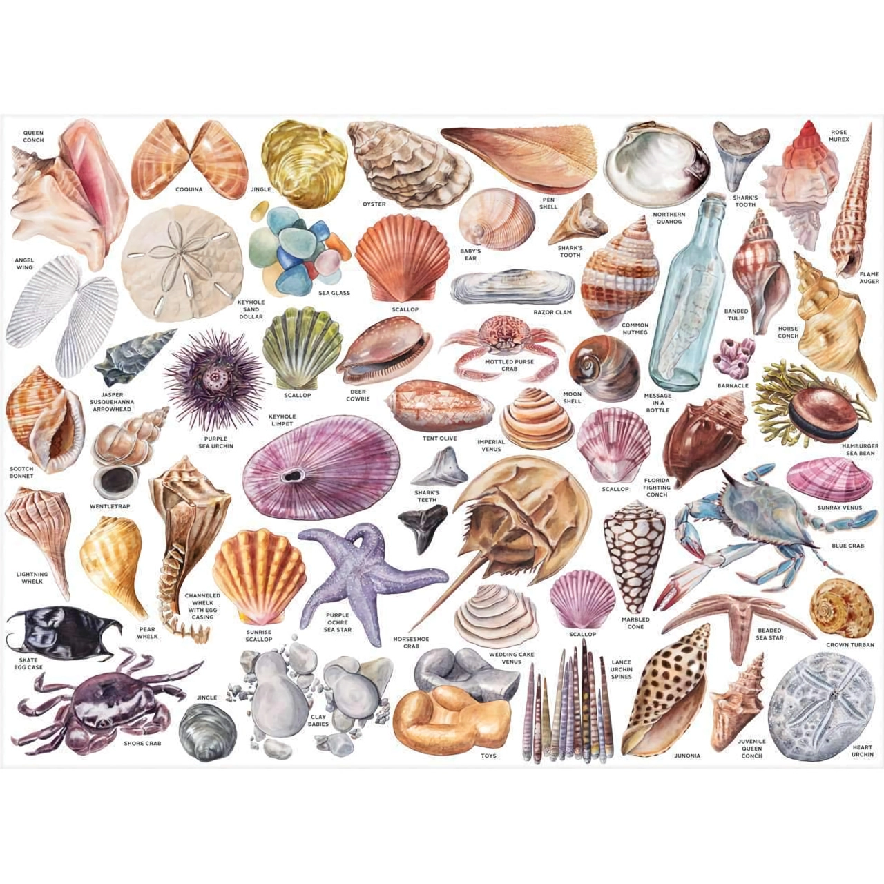 Legpuzzel met licentie op The Beachcomber’s Companion (De strandjuttersgids) van Anna Marlis Burgard, een bekende Amerikaanse reiziger en schrijfster, en tevens maker van multimediaprojecten. Toont natuurgetrouw schelpen van allerlei zeedieren en andere schatten die je tijdens wandelingen op het strand kunt tegenkomen. Sommige objecten zijn uitgevoerd als aparte puzzelstukjes met eigenzinnige vormen, wat een verfrissend element aan het leggen toevoegt. De illustraties zijn van Jillian Ditner, een wetenschappelijk illustrator vooral bekend in Noord-Amerika. Galison-puzzels worden geproduceerd met een aanzienlijk aandeel gerecycled papier en bieden eersteklas drukwerk met niet-giftige inkten. Ze hebben een matte afwerking die onder alle omstandigheden een natuurgetrouwe weergave van details en kleuren garandeert. De achterkant is bekleed met een glad oppervlak dat prettig aanvoelt en voorkomt dat er stof ontstaat wanneer de gelegde puzzel wordt bewaard. Samen met de zorgvuldig verpakte stukjes vind je in de doos ook een poster met het voorbeeld, die meestal extra informatie over de makers en de achtergrond van het werk bevat. Geleverd in een buitengewoon stevige en fraai uitgevoerde kartonnen doos van gerecycled karton en duurzaam verkregen materialen met FSC®-certificering. Belangrijkste kenmerken: 1000 nauwkeurig uitgesneden stukjes, waarvan 20 met unieke vorm; gemaakt met gerecyclede en duurzaam verkregen materialen; zorgvuldig gekozen motief van gerenommeerde makers en kunstenaars; druk en afwerking van de hoogste kwaliteit; inclusief voorbeeldposter.