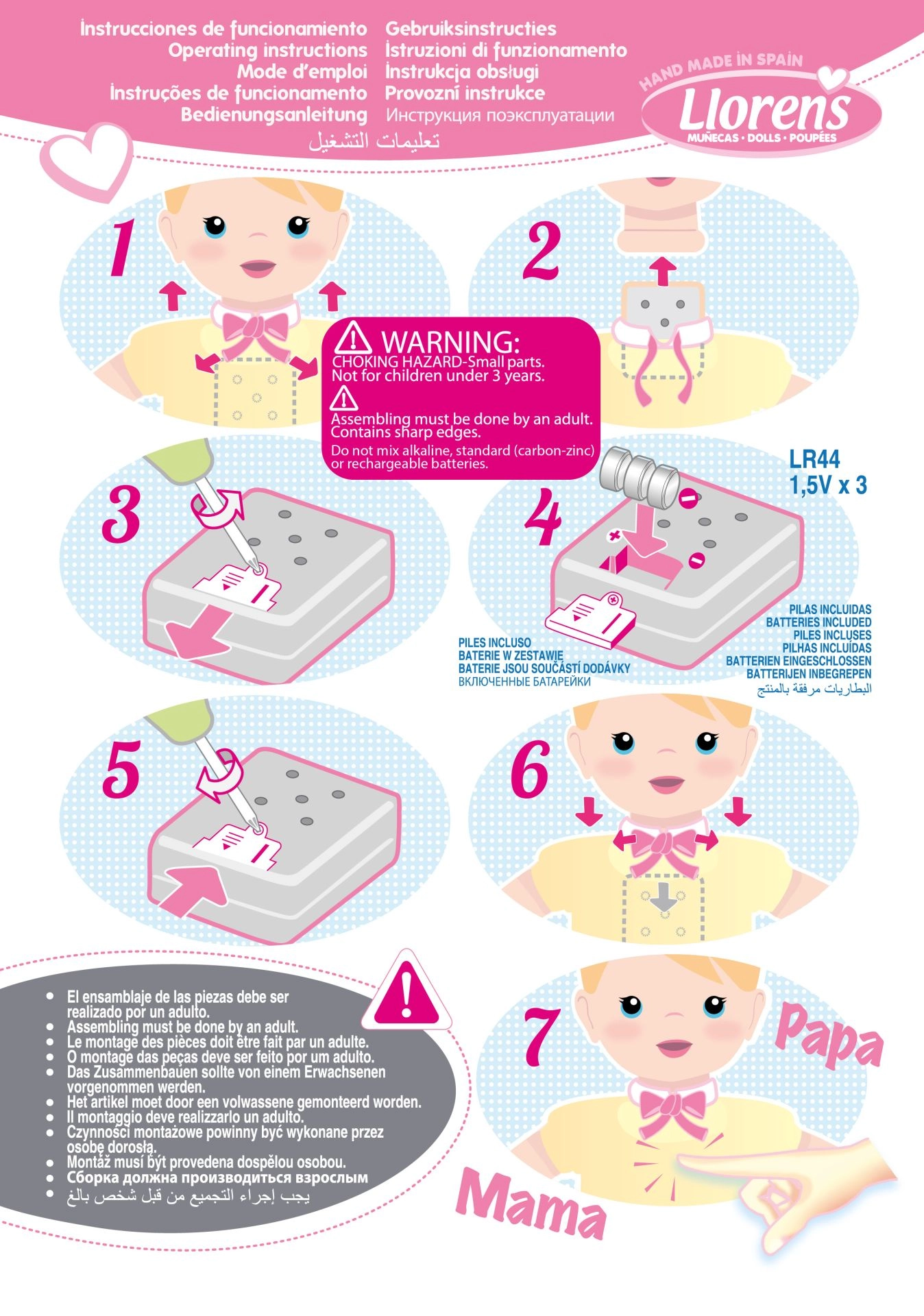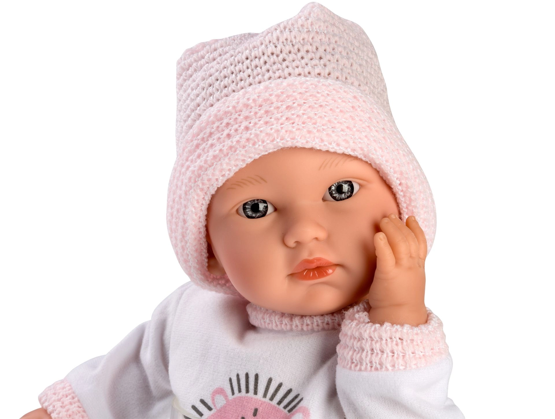 Bij het indrukken van het buikje huilt de pop en roept “mama, papa”, wat empathisch spel en de ontwikkeling van sociale vaardigheden ondersteunt. De outfit met schattige print en het gebreide mutsje zijn makkelijk aan en uit te trekken, wat de fijne motoriek stimuleert.